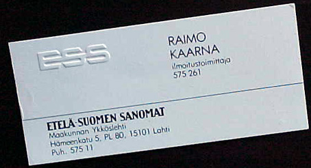 ![]() ![]() Kirjoitelmiani Etelä-Suomen Sanomien henkilöstölehteen Esalaiseen vuonna 1988, "pää-/toimittajakaudeltani"... Raimo Kaarna, Purokatu 18, 15200 Lahti raimo.kaarna@sci.fi