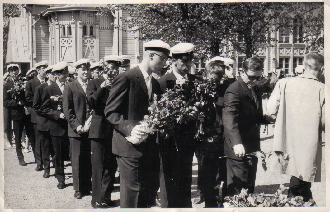 Puukirkko ja sankarihaudoilla käynti lakkiaispäivänä toukokuussa 1964. Eturivissä vasemmalla Linderborgin Kai, itse olen oikeanpuoleinen lakkipää.