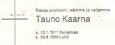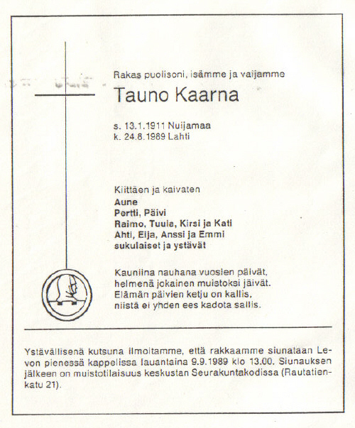 Äitini Aune Kaarna - s.22.3.1917 Nuijamaa, k.25.7.2004 Lahti - lepää isän vierellä Levon hautuumaalla.