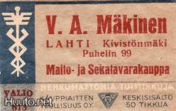 Kopioin nettihuutokauppasivulta hienoja vanhoja lahtelaisten tulitikkuetikettien kuvia Kuvan etiketti lienee noin vuodelta 1900, koska V. A. Mäkisen maito- ja sekatavarakaupan puhelinumerossa on vain kaksi numeroa !